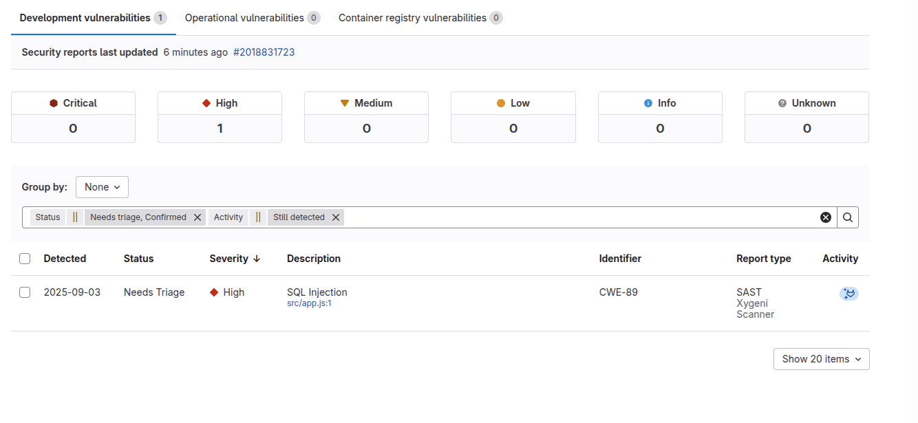 GitLab provides built-in security reporting capabilities that allow you to view security vulnerabilities directly within your GitLab project. When integrated with Xygeni, security findings can be automatically sent to GitLab's security dashboard, providing a centralized view of your project's security posture.