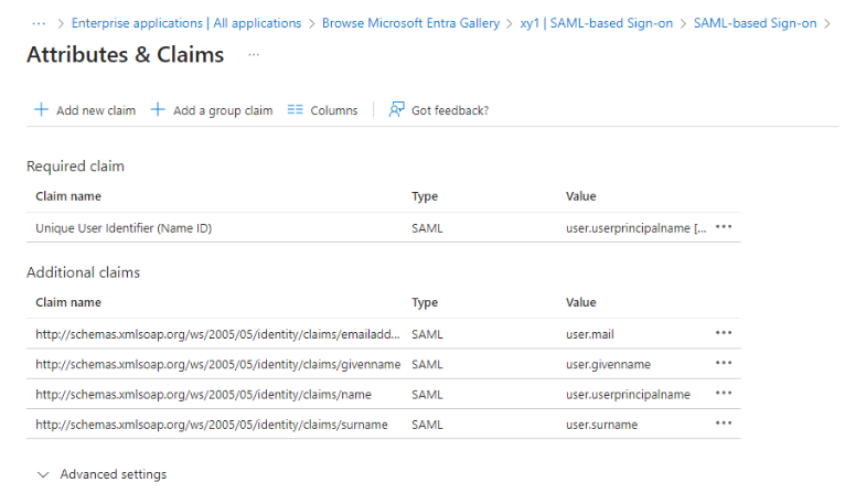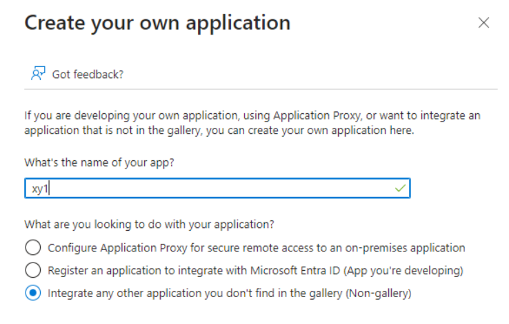 Choose whatever name you prefer to identify your app (in our example we will use "xy1" ). Entra ID will redirect you to the workflow to create your SAML integration.