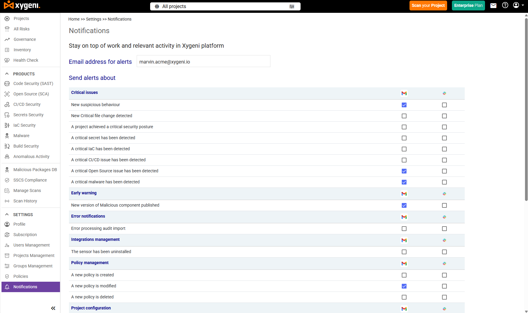 * Slack channel ( see [Collaboration & Communication Tools](https://docs.xygeni.io/xygeni-administration/platform-administration/integrations/collaboration-and-communication-tools) )