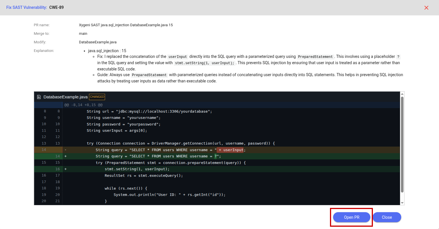 4. **Review AI-Generated Fix**: Xygeni's AI agent analyzes the issue and proposes a potential fix