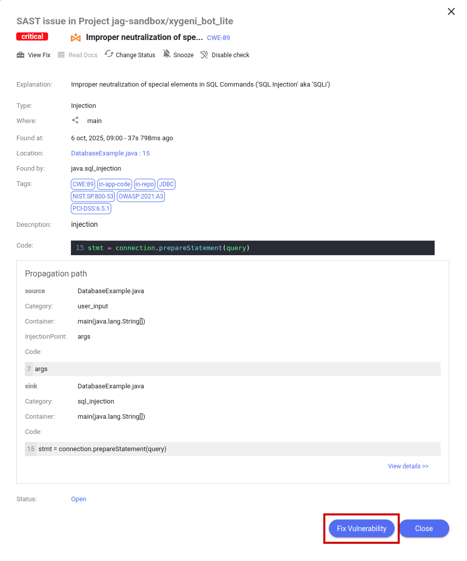 2. **Select a SAST Vulnerability**: Choose one of the identified code vulnerabilities