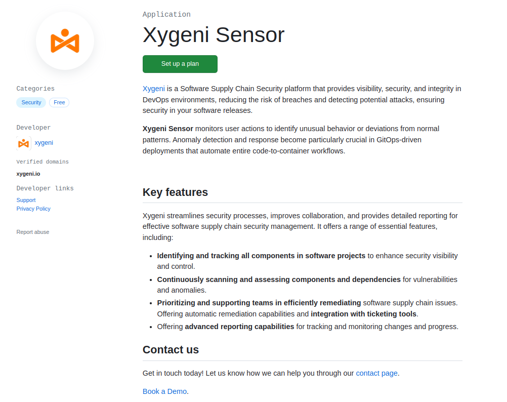 * Navigate to our app’s page at the GitHub marketplace: [Xygeni Sensor](https://github.com/marketplace/xygeni-sensor)
