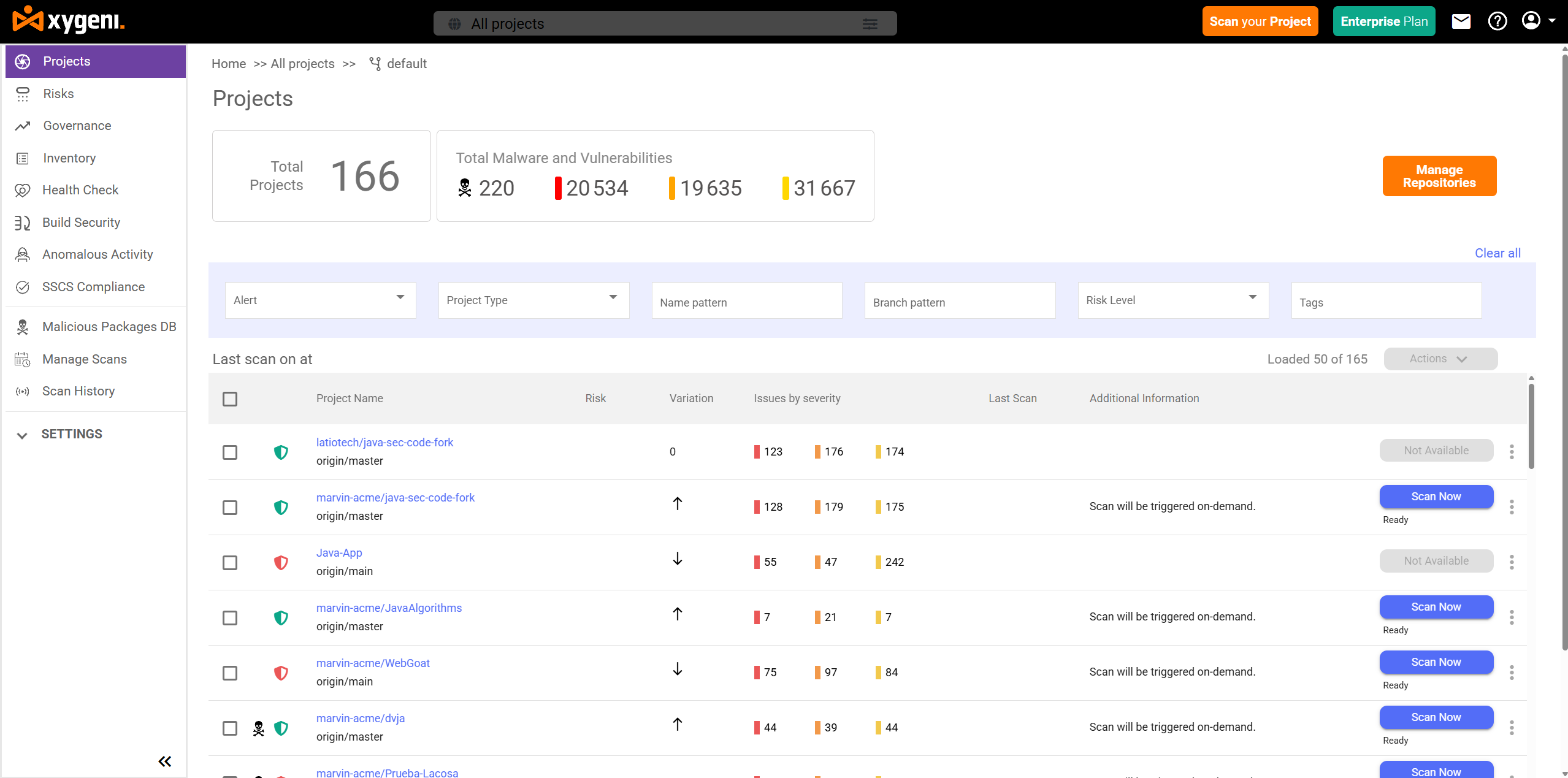 The ***Projects*** page provides a centralized view of all scanned and monitored projects across your organization. This dashboard is essential for tracking vulnerabilities and overall risk posture.